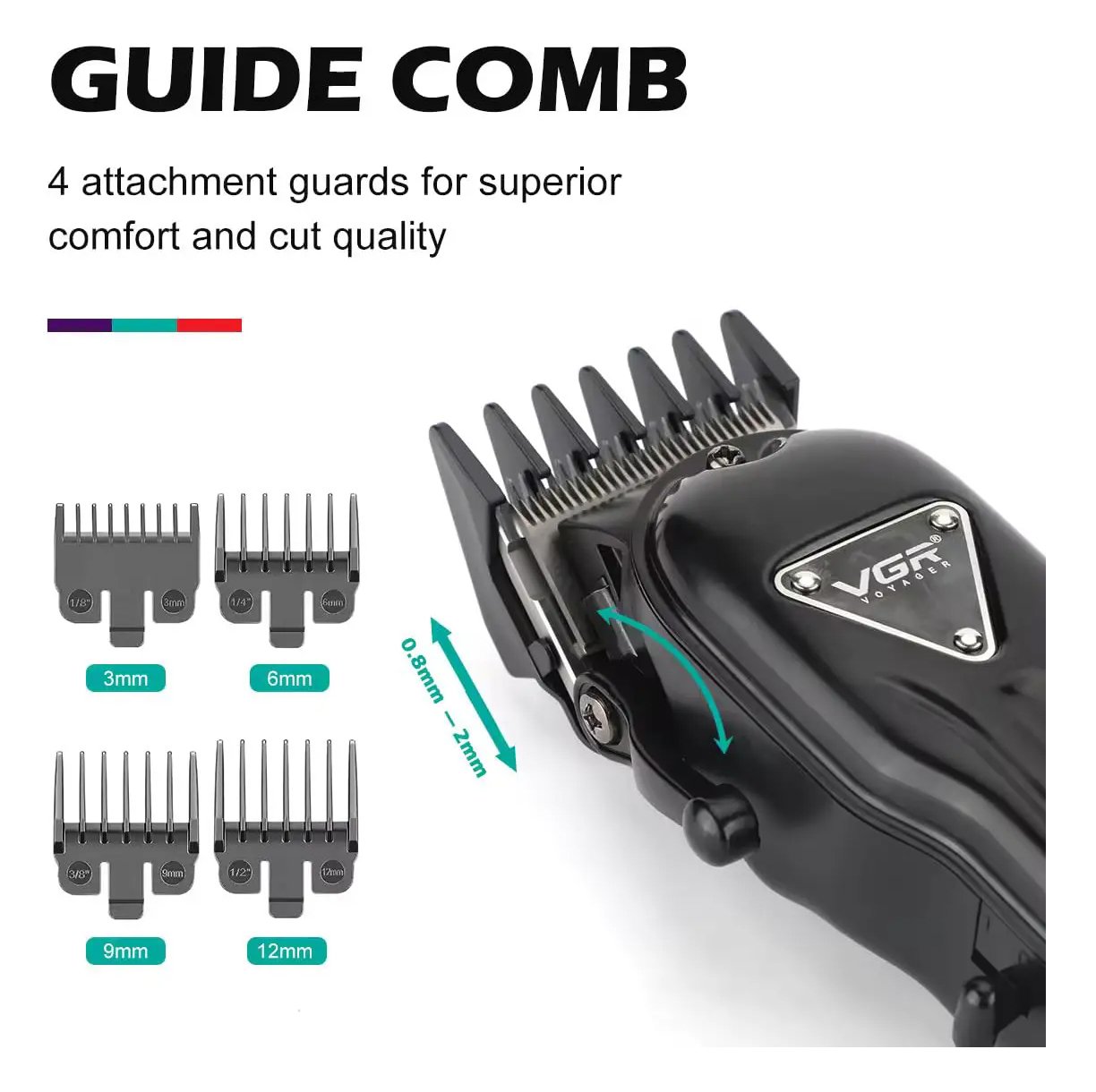 - Adjustable Cutting Guide Combs: Tailor your grooming experience with 4 adjustable cutting guide combs, allowing you to achieve the perfect length for your desired style, adjustable from 0.8mm to 2.0mm